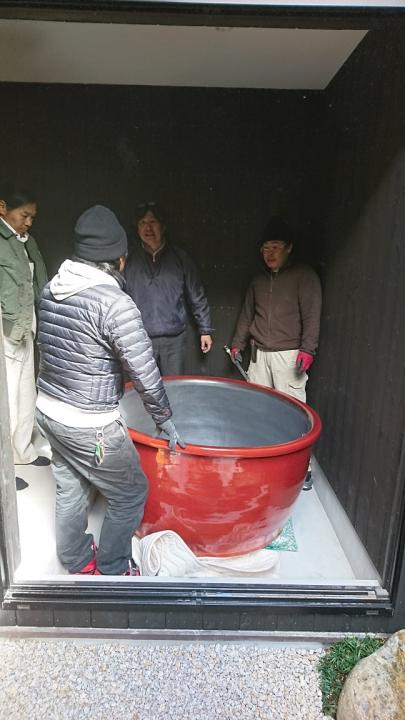 民泊工事 最終形態まで来ました 本日小雨の中お風呂の搬入です いろいろありましてお風呂遅れてましたが ようやくきました。 信楽の陶器風呂 別注制作品です。 大人4人でギリギリぐらいの重さでした。 無事に入り一安心、あとは設備やさんにお任せしときます。