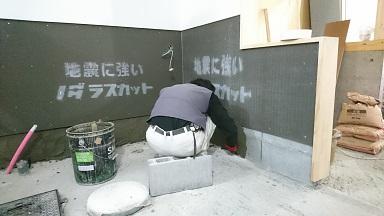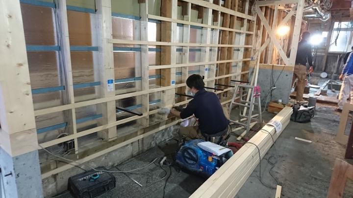 本日はポカポカ陽気の中、壁面下地工事そして 厨房壁下地ブロック工事にかかっていきます。 厨房など水を使うとこなどは最初にブロック 1段から3段程度建ててから壁を起こします、 そうする事で少しでも水を食い止める役割になっています。 壁は古い建物ですので ひとつづづ丁寧に確認しながら打っていきます